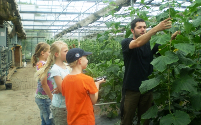 Dann ging er mit uns in die Gewächshäuser, wo es fast so heiß wie im Dschungel war! Dort gab es Strauchgemüse wie Bohnen, das fast immer ohne Hilfe nach oben wächst. Außerdem gibt es Fruchtgemüse wie Tomaten und Wurzelgemüse- da gehören Radieschen dazu und Nachtschattengewächse, also z.B. Kartoffeln.In der Nähe vom Gewächshaus stand auch eine Setzmaschine, die haben wir uns genauer angeschaut