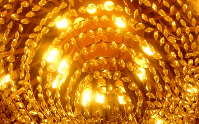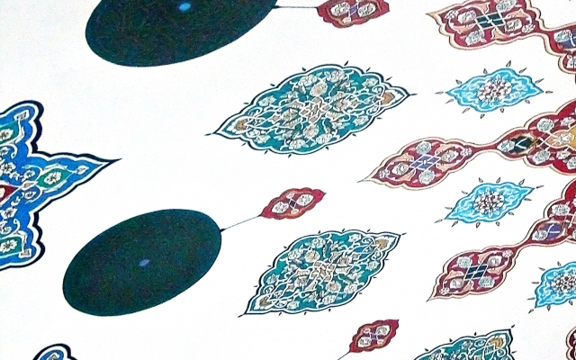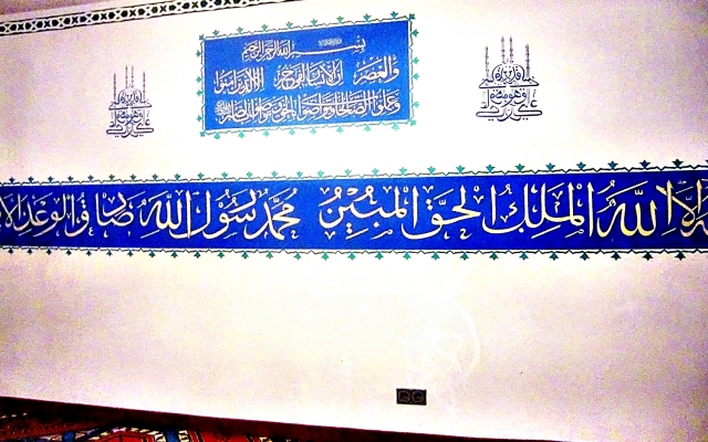 Im Islam sind Bilder von Gott nicht erlaubt, deswegen sind die Bilder in der Moschee bunten Muster und Schriften. Auch der Teppich ist gemustert und es gibt einen großen Kronleuchter.
