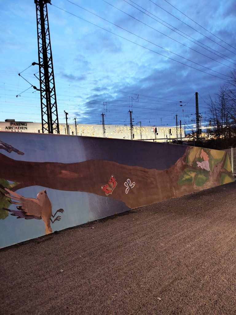 Ein tolles Graffiti-Kunstwerk ist ab sofort an der Brücke über der Pasinger Offenbachstraße, nördlich des S-Bahnhofs, zu sehen. Der bekannte Künstler Loomit gestaltete dort mit etwa 20 Kindern und Jugendlichen im Alter von zehn bis 14 Jahren eine bislang einfarbig weiße Innenseite mit einem farbenfrohen Baummotiv. Das Kunstwerk zeigt zwei Bäume, die sich mit ihren Kronen in der Mitte treffen und ineinander verflechten. Außerdem sind einige Tiere zu sehen – auch solche, die eigentlich gar nicht zu einem Baum gehören.