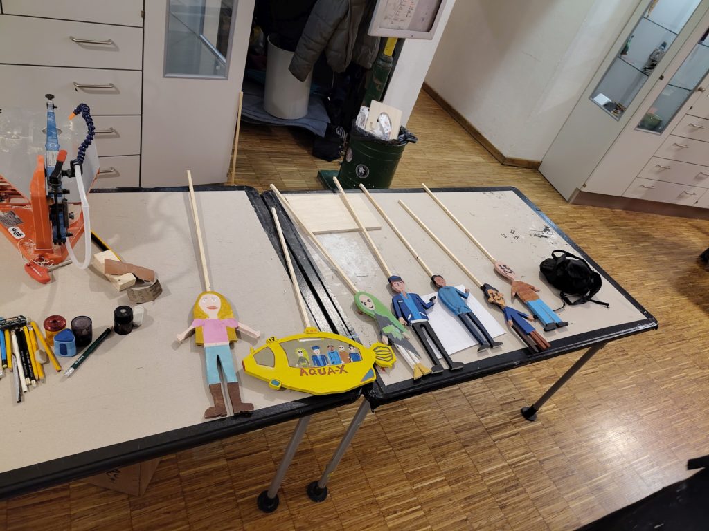 Der Fantasie waren keine Grenzen gesetzt: Bei Künstler Florian konnte man sogenannte „Stabfiguren“ bauen, also an einem Stab befestigte Figuren aus Holz. Die Kinder und Jugendliche malen erst die groben Umrisse auf ein Stück Holz und sägten diese dann zusammen mit Florian und einer speziellen Fräsemaschine aus. Anschließend bemalten die kleinen Künstler die Figuren mit Ölfarbe. Es entstanden Prinzessinnen, ein Polizist, ein Fuchs, ein Reh und ein Politiker . Selbstverständlich setzten die Kinder die Figuren danach auch ein und dachte sich eigene Theaterstücke aus. Zum Beispiel von einer Prinzessin, deren Vermögen nach einer Geburtstagsfeier geklaut wird und sie daher auf Verbrecherjagd geht. In dem Stück „Sei kein Schwein – spar Plastik ein“ es ging es um Umweltschutz, beginnend mit der Talkshow „Wer weiß es besser?“ und das teaterstük mit den vielen verschidenen Kulissen sollte vor allem einen lernefekt haben.