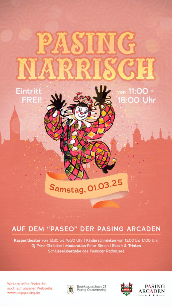 Bald ist es wieder soweit: Die größte Faschingsparty Pasings, „Pasing Narrisch“, lockt wieder mit einem Tag voller Karnevalspaß und einem vielfältigen Programm, auch gerade für Kinder. Die Pasinger Vereine haben das traditionelle Faschingstreiben heuer für Samstag, 14. Februar, von 11 bis 18 Uhr rund um die Pasing Arcaden vorbereitet.